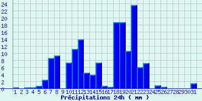 | Statistiques du mois | | Jours de fortes chaleurs (Tmax >= 30°C) | --- | | Jours de très fortes chaleurs (Tmax >= 35°C) | --- | | Jours avec nuit tropicale (Tmin >= 20°C) | --- | | Jours avec gelée (Tmin <= 0°C) | --- | | Jours avec forte gelée (Tmin <= -5°C) | --- | | Jours sans dégel (Tmax <= 0°C) | --- | | Jours avec pluie (RR >= 1mm) | 16 |