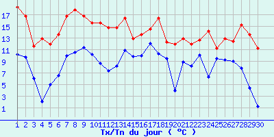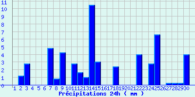 | Statistiques du mois | | Jours de fortes chaleurs (Tmax >= 30°C) | 0 | | Jours de très fortes chaleurs (Tmax >= 35°C) | 0 | | Jours avec nuit tropicale (Tmin >= 20°C) | 0 | | Jours avec gelée (Tmin <= 0°C) | 0 | | Jours avec forte gelée (Tmin <= -5°C) | 0 | | Jours sans dégel (Tmax <= 0°C) | 0 | | Jours avec pluie (RR >= 1mm) | 14 |