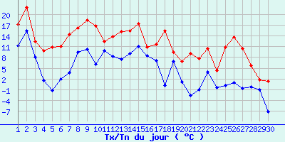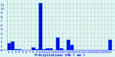 | Statistiques du mois | | Jours de fortes chaleurs (Tmax >= 30°C) | 0 | | Jours de très fortes chaleurs (Tmax >= 35°C) | 0 | | Jours avec nuit tropicale (Tmin >= 20°C) | 0 | | Jours avec gelée (Tmin <= 0°C) | 8 | | Jours avec forte gelée (Tmin <= -5°C) | 1 | | Jours sans dégel (Tmax <= 0°C) | 0 | | Jours avec pluie (RR >= 1mm) | 7 |
