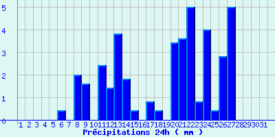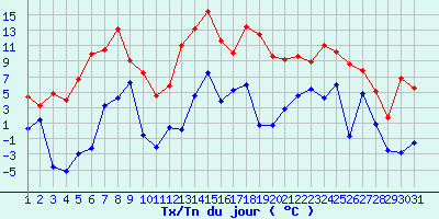 | Statistiques du mois | | Jours de fortes chaleurs (Tmax >= 30°C) | 0 | | Jours de très fortes chaleurs (Tmax >= 35°C) | 0 | | Jours avec nuit tropicale (Tmin >= 20°C) | 0 | | Jours avec gelée (Tmin <= 0°C) | 10 | | Jours avec forte gelée (Tmin <= -5°C) | 1 | | Jours sans dégel (Tmax <= 0°C) | 0 | | Jours avec pluie (RR >= 1mm) | 12 |