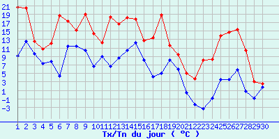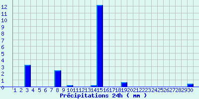 | Statistiques du mois | | Jours de fortes chaleurs (Tmax >= 30°C) | 0 | | Jours de très fortes chaleurs (Tmax >= 35°C) | 0 | | Jours avec nuit tropicale (Tmin >= 20°C) | 0 | | Jours avec gelée (Tmin <= 0°C) | 4 | | Jours avec forte gelée (Tmin <= -5°C) | 0 | | Jours sans dégel (Tmax <= 0°C) | 0 | | Jours avec pluie (RR >= 1mm) | 3 |