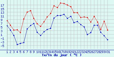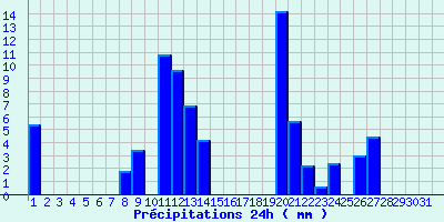 | Statistiques du mois | | Jours de fortes chaleurs (Tmax >= 30°C) | 0 | | Jours de très fortes chaleurs (Tmax >= 35°C) | 0 | | Jours avec nuit tropicale (Tmin >= 20°C) | 0 | | Jours avec gelée (Tmin <= 0°C) | 4 | | Jours avec forte gelée (Tmin <= -5°C) | 0 | | Jours sans dégel (Tmax <= 0°C) | 0 | | Jours avec pluie (RR >= 1mm) | 13 |