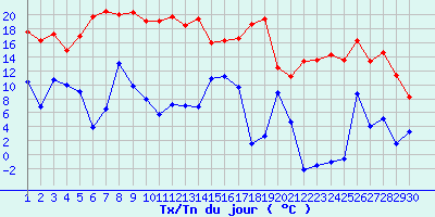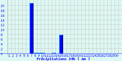 | Statistiques du mois | | Jours de fortes chaleurs (Tmax >= 30°C) | 0 | | Jours de très fortes chaleurs (Tmax >= 35°C) | 0 | | Jours avec nuit tropicale (Tmin >= 20°C) | 0 | | Jours avec gelée (Tmin <= 0°C) | 4 | | Jours avec forte gelée (Tmin <= -5°C) | 0 | | Jours sans dégel (Tmax <= 0°C) | 0 | | Jours avec pluie (RR >= 1mm) | 2 |