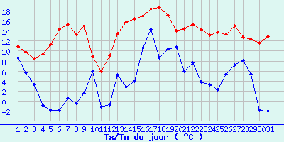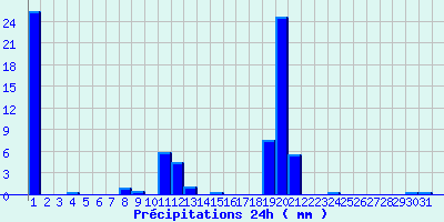 | Statistiques du mois | | Jours de fortes chaleurs (Tmax >= 30°C) | 0 | | Jours de très fortes chaleurs (Tmax >= 35°C) | 0 | | Jours avec nuit tropicale (Tmin >= 20°C) | 0 | | Jours avec gelée (Tmin <= 0°C) | 8 | | Jours avec forte gelée (Tmin <= -5°C) | 0 | | Jours sans dégel (Tmax <= 0°C) | 0 | | Jours avec pluie (RR >= 1mm) | 7 |