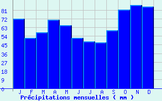 | Jan | Fev | Mars | Avr | Mai | Juin | Juil | Aout | Sept | Oct | Nov | Dec | Année | | Temp. max. (°C) | 9.4 | 11 | 14.4 | 16.9 | 20.8 | 24.3 | 26.8 | 26.7 | 23.5 | 18.9 | 13 | 9.8 | 18 | | Temp. moy. (°C) | 6.1 | 6.9 | 9.6 | 11.9 | 15.7 | 18.9 | 21 | 20.9 | 17.9 | 14.4 | 9.3 | 6.5 | 13.3 | | Temp. min. (°C) | 2.8 | 2.8 | 4.9 | 6.9 | 10.6 | 13.6 | 15.3 | 15 | 12.3 | 9.8 | 5.5 | 3.3 | 8.6 | | Jan | Fev | Mars | Avr | Mai | Juin | Juil | Aout | Sept | Oct | Nov | Dec | Année | | Jours Tx > 30°C | 0 | 0 | 0 | 0 | 0.7 | 3.9 | 7.4 | 6.6 | 2 | 0 | 0 | 0 | 20.7 | | Jours Tx > 25°C | 0 | 0 | 0.1 | 1.3 | 6.6 | 12.4 | 19.5 | 19.1 | 10.1 | 2.2 | 0 | 0 | 71.3 | | Jours Tx < 0°C | 1.4 | 0.2 | 0 | 0 | 0 | 0 | 0 | 0 | 0 | 0 | 0 | 0.4 | 1.9 | | Jours Tn < 0°C | 8.9 | 8.4 | 3.7 | 0.4 | 0 | 0 | 0 | 0 | 0 | 0.4 | 4.3 | 8.1 | 34.2 | | Jours Tn < -5°C | 1.8 | 0.8 | 0.2 | 0 | 0 | 0 | 0 | 0 | 0 | 0 | 0.4 | 1.1 | 4.3 | | Jours Tn < -10°C | 0.4 | 0.1 | 0 | 0 | 0 | 0 | 0 | 0 | 0 | 0 | 0 | 0 | 0.5 | | | | Jan | Fev | Mars | Avr | Mai | Juin | Juil | Aout | Sept | Oct | Nov | Dec | Année | | RR mensuel (mm) | 71.9 | 52 | 57.7 | 71 | 65.1 | 52.3 | 48.2 | 47.3 | 59.8 | 81.2 | 86.3 | 84.3 | 777.1 | | Jan | Fev | Mars | Avr | Mai | Juin | Juil | Aout | Sept | Oct | Nov | Dec | Année | | Jours RR > 1mm | 11.7 | 9.2 | 10.1 | 11.3 | 10.7 | 7.5 | 7 | 6.6 | 8 | 11.4 | 11.7 | 11.9 | 117 | | Jours RR > 5mm | 5.1 | 3.7 | 3.9 | 5.4 | 4.5 | 3.4 | 3.1 | 2.8 | 4.1 | 5.6 | 6 | 6.1 | 53.7 | | Jours RR > 10mm | 2.1 | 1.3 | 1.5 | 2.1 | 1.9 | 1.6 | 1.5 | 1.4 | 2 | 2.7 | 2.6 | 2.8 | 23.4 | | | | Jan | Fev | Mars | Avr | Mai | Juin | Juil | Aout | Sept | Oct | Nov | Dec | Année | | Vent moyen (km/h) | 13.7 | 14 | 14 | 14 | 12.2 | 11.5 | 11.5 | 10.4 | 10.8 | 12.2 | 12.2 | 13.3 | 12.6 | | Jan | Fev | Mars | Avr | Mai | Juin | Juil | Aout | Sept | Oct | Nov | Dec | Année | | Jours rafales >= 58km/h | 4.5 | 4.6 | 4.4 | 4 | 2.3 | 1.4 | 1.7 | 1.1 | 1.9 | 2.9 | 2.9 | 3.9 | 35.5 | | Jours rafales >= 100km/h | 0.1 | 0.3 | 0 | 0.1 | 0 | 0.1 | 0.1 | 0 | 0.1 | 0 | 0 | 0.1 | 1 | | | | Jan | Fev | Mars | Avr | Mai | Juin | Juil | Aout | Sept | Oct | Nov | Dec | Année | | Ensoleillement (heures) | 83 | 111.9 | 162.4 | 180.5 | 215.9 | 238.4 | 249.9 | 244.8 | 199.2 | 137.3 | 91.2 | 81.4 | 1995.9 |