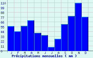 | Jan | Fev | Mars | Avr | Mai | Juin | Juil | Aout | Sept | Oct | Nov | Dec | Année | | Temp. max. (°C) | 13.6 | 13.9 | 15.9 | 18.4 | 22.7 | 26.5 | 29.8 | 29.7 | 26.1 | 22.2 | 17.5 | 14.6 | 20.9 | | Temp. moy. (°C) | 9.2 | 9.2 | 11.2 | 13.5 | 17.4 | 21.2 | 24.2 | 24.3 | 21 | 17.5 | 13.2 | 10.3 | 16.1 | | Temp. min. (°C) | 4.8 | 4.6 | 6.5 | 8.6 | 12.2 | 15.9 | 18.6 | 18.9 | 16 | 12.9 | 8.9 | 6.1 | 11.2 | | Jan | Fev | Mars | Avr | Mai | Juin | Juil | Aout | Sept | Oct | Nov | Dec | Année | | Jours Tx > 30°C | 0 | 0 | 0 | 0 | 0.5 | 4.7 | 13.9 | 13.4 | 2.3 | 0.3 | 0 | 0 | 35.1 | | Jours Tx > 25°C | 0 | 0 | 0.2 | 0.5 | 7.6 | 19.7 | 29.4 | 30.1 | 20.5 | 4.8 | 0.2 | 0.1 | 113 | | Jours Tx < 0°C | 0 | 0 | 0 | 0 | 0 | 0 | 0 | 0 | 0 | 0 | 0 | 0 | 0 | | Jours Tn < 0°C | 2.4 | 1.9 | 0.5 | 0 | 0 | 0 | 0 | 0 | 0 | 0 | 0 | 1.1 | 6 | | Jours Tn < -5°C | 0 | 0 | 0 | 0 | 0 | 0 | 0 | 0 | 0 | 0 | 0 | 0 | 0 | | Jours Tn < -10°C | 0 | 0 | 0 | 0 | 0 | 0 | 0 | 0 | 0 | 0 | 0 | 0 | 0 | | | | Jan | Fev | Mars | Avr | Mai | Juin | Juil | Aout | Sept | Oct | Nov | Dec | Année | | RR mensuel (mm) | 56.2 | 44.5 | 57.2 | 69.4 | 41.2 | 35.5 | 8.4 | 27.1 | 61.2 | 79.8 | 109.9 | 77.9 | 668.3 | | Jan | Fev | Mars | Avr | Mai | Juin | Juil | Aout | Sept | Oct | Nov | Dec | Année | | Jours RR > 1mm | 6 | 5.5 | 6.2 | 7.2 | 5.1 | 3.2 | 1 | 1.9 | 5.3 | 7.1 | 8.6 | 8.1 | 65.1 | | Jours RR > 5mm | 3.1 | 2.7 | 3.2 | 4.2 | 2.6 | 1.8 | 0.5 | 1.2 | 3 | 4.3 | 5.7 | 4.1 | 36.3 | | Jours RR > 10mm | 1.8 | 1.4 | 1.8 | 2.2 | 1.2 | 0.8 | 0.3 | 0.8 | 2.2 | 2.8 | 3.4 | 2.8 | 21.3 | | | | Jan | Fev | Mars | Avr | Mai | Juin | Juil | Aout | Sept | Oct | Nov | Dec | Année | | Vent moyen (km/h) | 14 | 13.7 | 14.4 | 14 | 12.2 | 13.7 | 13.3 | 13.3 | 13 | 13 | 13 | 14.4 | 13.3 | | Jan | Fev | Mars | Avr | Mai | Juin | Juil | Aout | Sept | Oct | Nov | Dec | Année | | Jours rafales >= 58km/h | 8.6 | 7.6 | 8.6 | 7.8 | 4.1 | 5 | 4.4 | 4.8 | 5.9 | 6.2 | 7.5 | 9.5 | 80.1 | | Jours rafales >= 100km/h | 0.1 | 0.4 | 0.3 | 0.2 | 0.1 | 0.1 | 0 | 0 | 0 | 0.2 | 0.3 | 0.4 | 2.1 | | | | Jan | Fev | Mars | Avr | Mai | Juin | Juil | Aout | Sept | Oct | Nov | Dec | Année | | Jours avec brouillard (*) | 0 | 0 | 0.1 | 0 | 0.2 | 0.1 | 0 | 0 | 0 | 0 | 0 | 0 | 0.5 | | Jours avec orage (*) | 1.1 | 0.9 | 1.4 | 1.8 | 1.5 | 2.7 | 1.7 | 2.7 | 3.6 | 3.5 | 2.9 | 1.6 | 25.3 | | Jours avec grêle (*) | 0.2 | 0.3 | 0.2 | 0.2 | 0 | 0.1 | 0 | 0 | 0 | 0 | 0.2 | 0.2 | 1.5 | | Jours avec neige (*) | 0.5 | 0.6 | 0.1 | 0 | 0 | 0 | 0 | 0 | 0 | 0 | 0.1 | 0.2 | 1.6 | | | | Jan | Fev | Mars | Avr | Mai | Juin | Juil | Aout | Sept | Oct | Nov | Dec | Année | | Ensoleillement (heures) | 135.6 | 155.5 | 206.5 | 233 | 290 | 324.5 | 370.1 | 323.2 | 243.7 | 182.5 | 130.6 | 118.3 | 2713.4 |