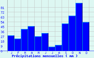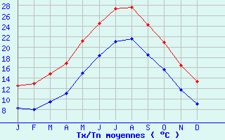 | Jan | Fev | Mars | Avr | Mai | Juin | Juil | Aout | Sept | Oct | Nov | Dec | Année | | Temp. max. (°C) | 12.6 | 13 | 14.8 | 16.9 | 21.2 | 24.6 | 27.3 | 27.7 | 24.2 | 20.9 | 16.4 | 13.4 | 19.5 | | Temp. moy. (°C) | 10.4 | 10.5 | 12.1 | 14 | 18.1 | 21.5 | 24.2 | 24.7 | 21.3 | 18.3 | 14.1 | 11.2 | 16.7 | | Temp. min. (°C) | 8.2 | 8 | 9.4 | 11.1 | 15 | 18.3 | 21.1 | 21.6 | 18.5 | 15.7 | 11.8 | 9 | 14 | | Jan | Fev | Mars | Avr | Mai | Juin | Juil | Aout | Sept | Oct | Nov | Dec | Année | | Jours Tx > 30°C | 0 | 0 | 0 | 0 | 0.3 | 1.3 | 4.1 | 4.4 | 0.7 | 0.1 | 0 | 0 | 10.9 | | Jours Tx > 25°C | 0 | 0 | 0 | 0.2 | 4.3 | 12.8 | 25.6 | 28 | 10.9 | 2.5 | 0 | 0.1 | 84.4 | | Jours Tx < 0°C | 0 | 0 | 0 | 0 | 0 | 0 | 0 | 0 | 0 | 0 | 0 | 0 | 0 | | Jours Tn < 0°C | 0.2 | 0.1 | 0.1 | 0 | 0 | 0 | 0 | 0 | 0 | 0 | 0 | 0.1 | 0.5 | | Jours Tn < -5°C | 0 | 0 | 0 | 0 | 0 | 0 | 0 | 0 | 0 | 0 | 0 | 0 | 0 | | Jours Tn < -10°C | 0 | 0 | 0 | 0 | 0 | 0 | 0 | 0 | 0 | 0 | 0 | 0 | 0 | | | | Jan | Fev | Mars | Avr | Mai | Juin | Juil | Aout | Sept | Oct | Nov | Dec | Année | | RR mensuel (mm) | 28.3 | 22.7 | 40.4 | 45.7 | 26.6 | 32.8 | 7.1 | 10.8 | 50.5 | 65.1 | 89.2 | 53.2 | 472.4 | | Jan | Fev | Mars | Avr | Mai | Juin | Juil | Aout | Sept | Oct | Nov | Dec | Année | | Jours RR > 1mm | 4.8 | 4.5 | 5.4 | 6.5 | 3.7 | 2.9 | 0.9 | 1.5 | 5 | 6.8 | 8.6 | 6.6 | 57.2 | | Jours RR > 5mm | 2 | 1.6 | 2.6 | 2.8 | 1.9 | 1.3 | 0.2 | 0.9 | 3 | 3.9 | 5.1 | 3.5 | 28.7 | | Jours RR > 10mm | 0.8 | 0.6 | 1.3 | 1.2 | 0.7 | 0.8 | 0.2 | 0.3 | 1.6 | 2.5 | 3.2 | 1.6 | 14.8 | | | | Jan | Fev | Mars | Avr | Mai | Juin | Juil | Aout | Sept | Oct | Nov | Dec | Année | | Vent moyen (km/h) | 18.7 | 20.2 | 19.8 | 19.1 | 15.8 | 16.6 | 15.8 | 15.5 | 17.3 | 16.6 | 19.4 | 22.3 | 18 | | Jan | Fev | Mars | Avr | Mai | Juin | Juil | Aout | Sept | Oct | Nov | Dec | Année | | Jours rafales >= 58km/h | 13.2 | 13.1 | 13.9 | 13.7 | -- | 10.1 | 10 | 10.1 | 11.6 | 11.3 | 14.4 | 15.7 | -- | | Jours rafales >= 100km/h | 3.7 | 4 | 4.2 | 2.8 | -- | 1.1 | 1.5 | 1.5 | 1.9 | 2.6 | 2.9 | 4.9 | -- | | | | Jan | Fev | Mars | Avr | Mai | Juin | Juil | Aout | Sept | Oct | Nov | Dec | Année | | Jours avec brouillard (*) | 0 | -- | 0.8 | 0.9 | -- | 0.5 | 0.2 | -- | 0 | 0.1 | 0.1 | 0.2 | -- | | Jours avec orage (*) | 0.5 | -- | 1.1 | 1.9 | -- | 2.1 | 1.2 | -- | 3.7 | 2.9 | 2.5 | 1.2 | -- | | Jours avec grêle (*) | 0.1 | -- | 0.4 | 0.3 | -- | 0 | 0 | -- | 0.1 | 0.1 | 0.3 | 0.4 | -- | | Jours avec neige (*) | 0.4 | -- | -- | 0.1 | -- | 0 | 0 | -- | -- | 0 | 0.1 | 0.2 | -- |