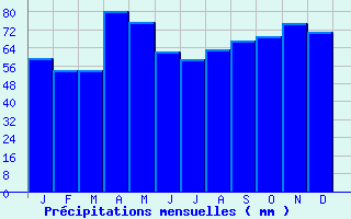 | Jan | Fev | Mars | Avr | Mai | Juin | Juil | Aout | Sept | Oct | Nov | Dec | Année | | Temp. max. (°C) | 9.8 | 11.9 | 15.5 | 17.5 | 22.1 | 25.2 | 27.4 | 27.7 | 23.9 | 19.6 | 13.3 | 10 | 18.7 | | Temp. moy. (°C) | 5.7 | 6.8 | 9.6 | 11.8 | 16 | 19.1 | 20.9 | 21.1 | 17.3 | 14.1 | 8.8 | 6 | 13.1 | | Temp. min. (°C) | 1.7 | 1.6 | 3.7 | 6 | 9.9 | 13 | 14.5 | 14.4 | 10.7 | 8.6 | 4.4 | 2 | 7.6 | | Jan | Fev | Mars | Avr | Mai | Juin | Juil | Aout | Sept | Oct | Nov | Dec | Année | | Jours Tx > 30°C | 0 | 0 | 0 | 0 | 1.1 | 4.7 | 8.7 | 9.4 | 2.2 | 0.1 | 0 | 0 | 26.1 | | Jours Tx > 25°C | 0 | 0 | 0.2 | 1.6 | 8.7 | 15.3 | 21.5 | 22.2 | 11.8 | 3.5 | 0 | 0 | 84.7 | | Jours Tx < 0°C | 0.6 | 0 | 0 | 0 | 0 | 0 | 0 | 0 | 0 | 0 | 0 | 0.9 | 1.6 | | Jours Tn < 0°C | 12.6 | 12.1 | 7.1 | 1.6 | 0.1 | 0 | 0 | 0 | 0 | 1.6 | 5.9 | 11.1 | 52 | | Jours Tn < -5°C | 2.7 | 2 | 0.5 | 0 | 0 | 0 | 0 | 0 | 0 | 0.1 | 1 | 2.8 | 9.2 | | Jours Tn < -10°C | 0.1 | 0.1 | 0.1 | 0 | 0 | 0 | 0 | 0 | 0 | 0 | 0 | 0.4 | 0.5 | | | | Jan | Fev | Mars | Avr | Mai | Juin | Juil | Aout | Sept | Oct | Nov | Dec | Année | | RR mensuel (mm) | 59.4 | 53.8 | 53.8 | 80.4 | 75.3 | 62.2 | 58.6 | 63.1 | 67.2 | 68.9 | 74.7 | 70.9 | 788.3 | | Jan | Fev | Mars | Avr | Mai | Juin | Juil | Aout | Sept | Oct | Nov | Dec | Année | | Jours RR > 1mm | 10.4 | 8.4 | 9.4 | 12.3 | 9.8 | 8.5 | 7.3 | 7.5 | 8.5 | 9.5 | 10.9 | 10.2 | 112.6 | | Jours RR > 5mm | 4.1 | 3.7 | 4 | 5.7 | 5 | 4 | 3.4 | 3.7 | 4.4 | 4.7 | 5.3 | 5.5 | 53.3 | | Jours RR > 10mm | 1.6 | 1.8 | 1.4 | 2.3 | 2.7 | 1.8 | 2 | 2.4 | 2.1 | 2 | 2.4 | 1.8 | 24.2 | | | | Jan | Fev | Mars | Avr | Mai | Juin | Juil | Aout | Sept | Oct | Nov | Dec | Année | | Vent moyen (km/h) | 9 | 10.1 | 10.4 | 10.1 | 9 | 8.6 | 8.3 | 7.6 | 7.6 | 8.3 | 8.6 | 9 | 9 | | Jan | Fev | Mars | Avr | Mai | Juin | Juil | Aout | Sept | Oct | Nov | Dec | Année | | Jours rafales >= 58km/h | 2.2 | 3.4 | 2.6 | 3 | 1.6 | 1.5 | 1.3 | 1.5 | 1.2 | 1.1 | 1.7 | 2.4 | 23.4 | | Jours rafales >= 100km/h | 0.1 | 0.1 | 0 | 0 | 0 | 0 | 0 | 0 | 0 | 0.1 | 0 | 0.1 | 0.3 | | | | Jan | Fev | Mars | Avr | Mai | Juin | Juil | Aout | Sept | Oct | Nov | Dec | Année | | Ensoleillement (heures) | 85.4 | 111.3 | 167.4 | 178 | 210.8 | 231.7 | 248 | 240.2 | 199.3 | 136.9 | 88.7 | 78.2 | 1976 |
