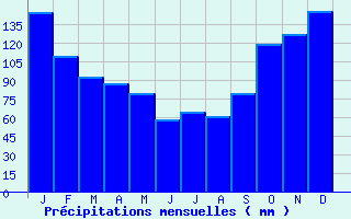 | Jan | Fev | Mars | Avr | Mai | Juin | Juil | Aout | Sept | Oct | Nov | Dec | Année | | Temp. max. (°C) | 9.1 | 9.3 | 11.3 | 13 | 16 | 18.5 | 20.5 | 20.6 | 18.9 | 15.6 | 12 | 9.7 | 14.6 | | Temp. moy. (°C) | 6.6 | 6.5 | 8.2 | 9.4 | 12.3 | 14.7 | 16.7 | 16.8 | 15.1 | 12.4 | 9.2 | 7.1 | 11.3 | | Temp. min. (°C) | 4.1 | 3.7 | 5.1 | 5.7 | 8.6 | 10.9 | 12.9 | 12.9 | 11.3 | 9.3 | 6.5 | 4.5 | 8 | | Jan | Fev | Mars | Avr | Mai | Juin | Juil | Aout | Sept | Oct | Nov | Dec | Année | | Jours Tx > 30°C | 0 | 0 | 0 | 0 | 0 | 0.2 | 0.4 | 0.3 | 0 | 0 | 0 | 0 | 0.9 | | Jours Tx > 25°C | 0 | 0 | 0 | 0.1 | 0.6 | 1.5 | 3.2 | 2.7 | 1.3 | 0 | 0 | 0 | 9.4 | | Jours Tx < 0°C | 0.2 | 0.3 | 0 | 0 | 0 | 0 | 0 | 0 | 0 | 0 | 0 | 0 | 0.5 | | Jours Tn < 0°C | 4.9 | 4.9 | 1.6 | 0.8 | 0.1 | 0 | 0 | 0 | 0 | 0.1 | 1.4 | 4.1 | 17.8 | | Jours Tn < -5°C | 0.5 | 0.4 | 0 | 0 | 0 | 0 | 0 | 0 | 0 | 0 | 0 | 0.1 | 1 | | Jours Tn < -10°C | 0 | 0 | 0 | 0 | 0 | 0 | 0 | 0 | 0 | 0 | 0 | 0 | 0 | | | | Jan | Fev | Mars | Avr | Mai | Juin | Juil | Aout | Sept | Oct | Nov | Dec | Année | | RR mensuel (mm) | 144.6 | 108.8 | 92.7 | 87 | 78.9 | 58.1 | 64.4 | 60.3 | 78.8 | 118.5 | 127.2 | 145.8 | 1165.1 | | Jan | Fev | Mars | Avr | Mai | Juin | Juil | Aout | Sept | Oct | Nov | Dec | Année | | Jours RR > 1mm | 17.6 | 13.9 | 14.7 | 13 | 11.1 | 8.8 | 10.7 | 9.6 | 10.7 | 15.4 | 16.8 | 17.3 | 159.6 | | Jours RR > 5mm | 9.5 | 7.7 | 6.2 | 6.2 | 5 | 4 | 4 | 3.3 | 5.1 | 7.4 | 9.1 | 9.2 | 76.7 | | Jours RR > 10mm | 5 | 3.7 | 2.5 | 2.7 | 2.2 | 1.7 | 1.9 | 1.7 | 2.6 | 3.8 | 4.7 | 4.8 | 37.2 | | | | Jan | Fev | Mars | Avr | Mai | Juin | Juil | Aout | Sept | Oct | Nov | Dec | Année | | Vent moyen (km/h) | 19.4 | 18.4 | 18.4 | 18 | 17.3 | 15.5 | 15.5 | 14.4 | 15.1 | 16.6 | 16.9 | 18.4 | 16.9 | | Jan | Fev | Mars | Avr | Mai | Juin | Juil | Aout | Sept | Oct | Nov | Dec | Année | | Jours rafales >= 58km/h | 12.3 | 9.6 | 9.8 | 7.1 | 4.2 | 2.9 | -- | 2.8 | 4.4 | 7.7 | 9.2 | 11 | -- | | Jours rafales >= 100km/h | 0.8 | 0.4 | 0.2 | 0 | 0 | 0 | -- | 0 | 0 | 0.2 | 0.2 | 0.6 | -- | | | | Jan | Fev | Mars | Avr | Mai | Juin | Juil | Aout | Sept | Oct | Nov | Dec | Année | | Ensoleillement (heures) | 60.4 | 73.8 | 110.4 | 142.9 | 170.5 | 183.1 | 168.5 | 165.1 | 154.3 | 105 | 68.2 | 61.7 | 1463.8 |