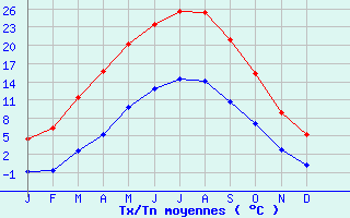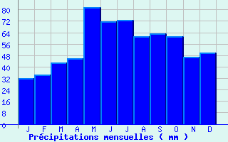 | Jan | Fev | Mars | Avr | Mai | Juin | Juil | Aout | Sept | Oct | Nov | Dec | Année | | Temp. max. (°C) | 4.5 | 6.4 | 11.4 | 15.7 | 20.2 | 23.4 | 25.7 | 25.4 | 21 | 15.3 | 8.8 | 5.2 | 15.3 | | Temp. moy. (°C) | 1.8 | 2.9 | 6.9 | 10.5 | 15 | 18.1 | 20.1 | 19.7 | 15.8 | 11.2 | 5.8 | 2.8 | 10.9 | | Temp. min. (°C) | -0.8 | -0.6 | 2.5 | 5.2 | 9.8 | 12.8 | 14.5 | 14.1 | 10.6 | 7.1 | 2.8 | 0.3 | 6.6 | | Jan | Fev | Mars | Avr | Mai | Juin | Juil | Aout | Sept | Oct | Nov | Dec | Année | | Jours Tx > 30°C | 0 | 0 | 0 | 0 | 0.6 | 2.5 | 5.8 | 4.5 | 0.4 | 0 | 0 | 0 | 13.9 | | Jours Tx > 25°C | 0 | 0 | 0 | 1.2 | 5.8 | 11.7 | 17.1 | 16 | 5.2 | 0.4 | 0 | 0 | 57.5 | | Jours Tx < 0°C | 6.9 | 3 | 0.1 | 0 | 0 | 0 | 0 | 0 | 0 | 0 | 1 | 4.2 | 15.1 | | Jours Tn < 0°C | 16.5 | 15.2 | 9 | 2.2 | 0.1 | 0 | 0 | 0 | 0 | 1.7 | 7.5 | 13.8 | 65.9 | | Jours Tn < -5°C | 5.7 | 4.7 | 0.9 | 0 | 0 | 0 | 0 | 0 | 0 | 0 | 1.1 | 3.6 | 16.1 | | Jours Tn < -10°C | 1.9 | 0.8 | 0.1 | 0 | 0 | 0 | 0 | 0 | 0 | 0 | 0 | 0.6 | 3.4 | | | | Jan | Fev | Mars | Avr | Mai | Juin | Juil | Aout | Sept | Oct | Nov | Dec | Année | | RR mensuel (mm) | 32.2 | 34.5 | 42.8 | 45.9 | 81.9 | 71.6 | 72.7 | 61.4 | 63.5 | 61.5 | 47 | 50 | 665 | | Jan | Fev | Mars | Avr | Mai | Juin | Juil | Aout | Sept | Oct | Nov | Dec | Année | | Jours RR > 1mm | 8.4 | 8.1 | 9.1 | 9.2 | 11.5 | 10.7 | 10.8 | 9.9 | 8.6 | 9.5 | 9.3 | 9.8 | 114.9 | | Jours RR > 5mm | 1.7 | 2.3 | 2.7 | 3.3 | 5.2 | 4.8 | 4.9 | 4.3 | 4.1 | 4.1 | 2.7 | 2.8 | 43.1 | | Jours RR > 10mm | 0.3 | 0.5 | 0.8 | 0.9 | 2.4 | 2.1 | 2 | 1.6 | 1.9 | 1.7 | 1 | 1.1 | 16.4 | | | | Jan | Fev | Mars | Avr | Mai | Juin | Juil | Aout | Sept | Oct | Nov | Dec | Année | | Vent moyen (km/h) | 11.9 | 11.5 | 12.2 | 11.2 | 10.4 | 10.1 | 9.4 | 8.6 | 9 | 9.7 | 9.7 | 11.2 | 10.4 | | Jan | Fev | Mars | Avr | Mai | Juin | Juil | Aout | Sept | Oct | Nov | Dec | Année | | Jours rafales >= 58km/h | 4.3 | 3.8 | 4.3 | 2.4 | 1.7 | 2.3 | 1.8 | 1.3 | 1.5 | 2.1 | 2 | 3.8 | 31.3 | | Jours rafales >= 100km/h | 0.3 | 0.2 | 0.1 | 0 | 0 | 0.1 | 0 | 0 | 0 | 0.1 | 0 | 0.2 | 1.1 | | | | Jan | Fev | Mars | Avr | Mai | Juin | Juil | Aout | Sept | Oct | Nov | Dec | Année | | Jours avec brouillard (*) | 7.6 | 4.3 | 2 | 1.2 | 1.8 | 1.1 | 0.9 | 1.5 | 4.6 | 9.7 | 8.5 | 7.3 | 50.6 | | Jours avec orage (*) | 0.2 | 0.4 | 0.5 | 1.6 | 5 | 5.9 | 6.2 | 5 | 2 | 0.8 | 0.2 | 0.1 | 27.9 | | Jours avec grêle (*) | 0.1 | 0 | 0.2 | 0.2 | 0.3 | 0.3 | 0.1 | 0.1 | 0 | 0 | 0 | 0 | 1.4 | | Jours avec neige (*) | 7 | 6.7 | 3.3 | 0.7 | 0 | 0 | 0 | 0 | 0 | 0.1 | 2.2 | 6 | 25.9 | | | | Jan | Fev | Mars | Avr | Mai | Juin | Juil | Aout | Sept | Oct | Nov | Dec | Année | | Ensoleillement (heures) | 58.1 | 83.8 | 134.8 | 180 | 202.5 | 223.8 | 228.6 | 219.6 | 164.5 | 98.7 | 55.3 | 43.1 | 1692.7 |