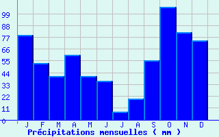 | Jan | Fev | Mars | Avr | Mai | Juin | Juil | Aout | Sept | Oct | Nov | Dec | Année | | Temp. max. (°C) | 13.1 | 13.4 | 15.5 | 17.4 | 21.3 | 25.1 | 28.2 | 28.4 | 25 | 21 | 16.6 | 13.9 | 19.9 | | Temp. moy. (°C) | 8.7 | 8.9 | 10.9 | 12.9 | 16.6 | 20.2 | 23 | 23.1 | 20.1 | 16.8 | 12.5 | 9.7 | 15.3 | | Temp. min. (°C) | 4.4 | 4.3 | 6.3 | 8.4 | 11.9 | 15.3 | 17.8 | 17.8 | 15.2 | 12.5 | 8.4 | 5.5 | 10.7 | | Jan | Fev | Mars | Avr | Mai | Juin | Juil | Aout | Sept | Oct | Nov | Dec | Année | | Jours Tx > 30°C | 0 | 0 | 0 | 0 | 0.1 | 1.6 | 7.3 | 7.2 | 0.3 | 0 | 0 | 0 | 16.5 | | Jours Tx > 25°C | 0 | 0 | 0.2 | 0.1 | 3.1 | 15.2 | 28.4 | 28.9 | 15.2 | 1.6 | 0 | 0 | 92.7 | | Jours Tx < 0°C | 0.1 | 0 | 0 | 0 | 0 | 0 | 0 | 0 | 0 | 0 | 0 | 0 | 0.1 | | Jours Tn < 0°C | 3.8 | 2.9 | 0.7 | 0 | 0 | 0 | 0 | 0 | 0 | 0 | 0.3 | 1.9 | 9.7 | | Jours Tn < -5°C | 0.1 | 0.1 | 0 | 0 | 0 | 0 | 0 | 0 | 0 | 0 | 0 | 0 | 0.2 | | Jours Tn < -10°C | 0 | 0 | 0 | 0 | 0 | 0 | 0 | 0 | 0 | 0 | 0 | 0 | 0 | | | | Jan | Fev | Mars | Avr | Mai | Juin | Juil | Aout | Sept | Oct | Nov | Dec | Année | | RR mensuel (mm) | 79.1 | 52.6 | 40.7 | 60.4 | 40.6 | 35.8 | 7.5 | 19.3 | 55.4 | 105.4 | 81.3 | 73.9 | 652 | | Jan | Fev | Mars | Avr | Mai | Juin | Juil | Aout | Sept | Oct | Nov | Dec | Année | | Jours RR > 1mm | 5.9 | 4.9 | 4.4 | 6.3 | 4.5 | 3 | 1.1 | 1.8 | 4.5 | 6.9 | 6.9 | 6.7 | 56.8 | | Jours RR > 5mm | 3.6 | 2.7 | 2.2 | 3.4 | 2.1 | 1.6 | 0.5 | 0.9 | 2.6 | 4.4 | 4.1 | 3.8 | 31.8 | | Jours RR > 10mm | 2.3 | 1.8 | 1.1 | 2 | 1.3 | 1 | 0.2 | 0.6 | 1.6 | 3.2 | 2.6 | 2.2 | 19.8 | | | | Jan | Fev | Mars | Avr | Mai | Juin | Juil | Aout | Sept | Oct | Nov | Dec | Année | | Vent moyen (km/h) | 14.4 | 15.1 | 15.5 | 15.5 | 13 | 13.3 | 13 | 12.6 | 12.6 | 13.3 | 14 | 14 | 13.7 | | Jan | Fev | Mars | Avr | Mai | Juin | Juil | Aout | Sept | Oct | Nov | Dec | Année | | Jours rafales >= 58km/h | 8.6 | 7.6 | 8.7 | 8.4 | 5.2 | 5.4 | 5.6 | 4.8 | 4.9 | 6.4 | 7.1 | 7.3 | 80.1 | | Jours rafales >= 100km/h | 0.3 | 0.2 | 0.1 | 0 | 0 | 0 | 0 | 0 | 0 | 0.1 | 0.3 | 0.5 | 1.6 | | | | Jan | Fev | Mars | Avr | Mai | Juin | Juil | Aout | Sept | Oct | Nov | Dec | Année | | Jours avec brouillard (*) | 0.4 | 0.2 | 0.5 | 0.7 | 0.6 | 0.3 | 0.5 | 0.5 | 0.4 | 0.4 | 0.3 | 0.3 | 5.1 | | Jours avec orage (*) | 0.8 | 0.7 | 0.7 | 1.2 | 2.2 | 2.4 | 2 | 2.6 | 3.1 | 2.9 | 2 | 0.9 | 21.5 | | Jours avec grêle (*) | 0.3 | 0.1 | 0.1 | 0 | 0 | 0.1 | 0 | 0 | 0 | 0.1 | 0.3 | 0.1 | 1.2 | | Jours avec neige (*) | 0.4 | 0.2 | 0 | 0 | 0 | 0 | 0 | 0 | 0 | 0 | 0.1 | 0.1 | 0.9 |